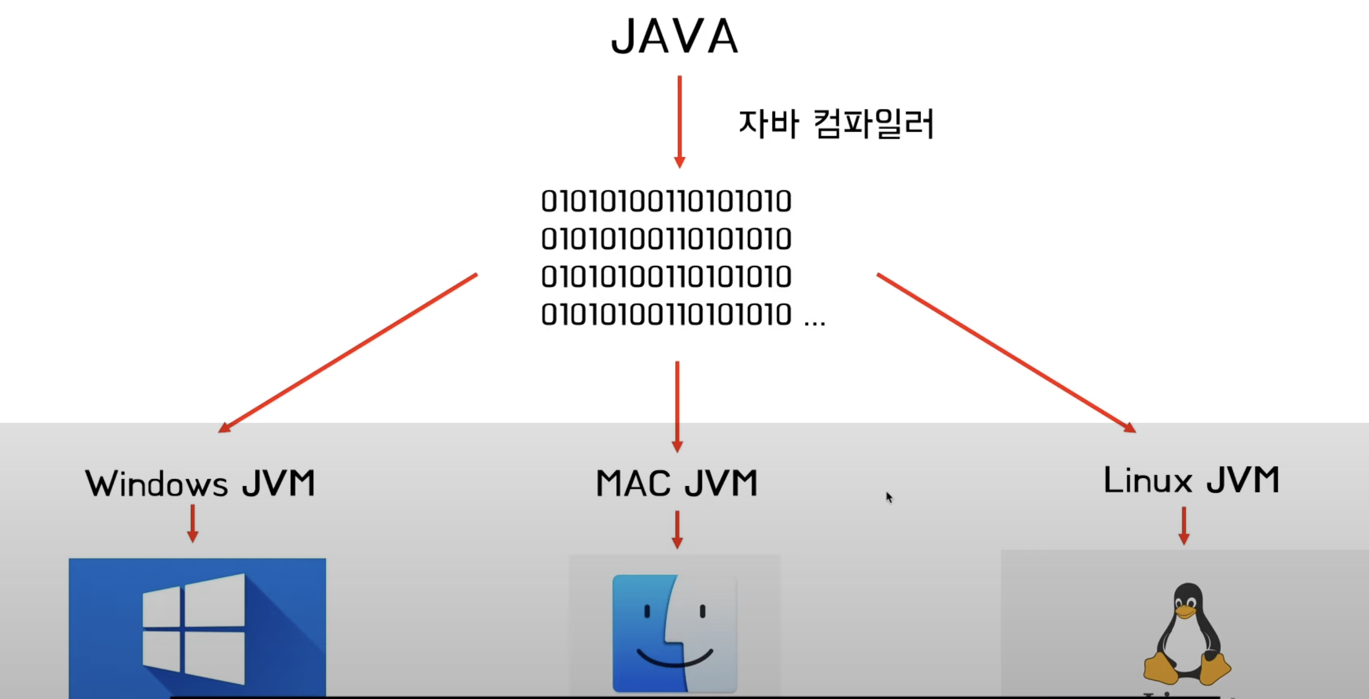 - 하지만 운영체제(OS)마다 바이너리 코드를 해석하는 방식이 다르다. 그래서 컴파일을 통해 바이너리 코드로 변환시킨다 하더라도 특정 OS에서만 작동하고 다른 OS에서는 작동하지 않는다.