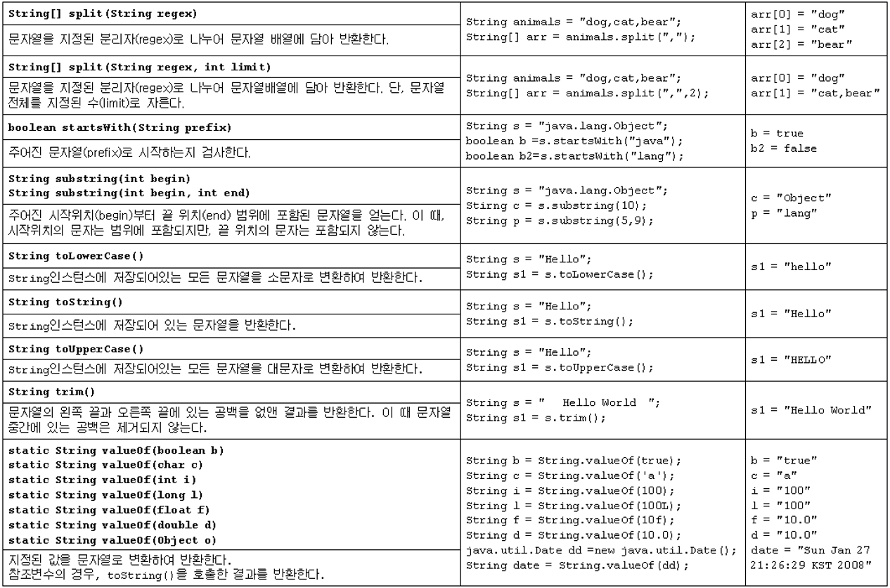 이를 보완한 메서드가 다음에 정리할 StringBuffer, Stringbuilder 메서드다. (String Buffer글 참조)