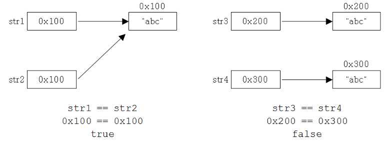 ""로 정의하면 같은 문자열인 경우 하나의 인스턴스를 두 이름으로 참조하게 되고 new String을 하게되면 서로 다른 인스턴스를 생성하게 된다. 그래서 후자의 방식은 == 연산을 사용하면 주소가 다르므로 false결과가 도출된다. 값을 비교하려면 equals() 메서드를 사용해야 한다. (String 클래스에 equals() 메서드를 오버라이딩했기 때문에 두 객체의 문자열을 비교함.)