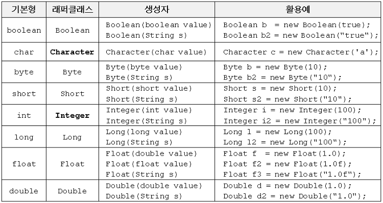 기본형 변수를 객체로 변환해주는 클래스. 기본형 변수는 각자의 래퍼 클래스가 존재하고 클래스 이름은 각 타입의 풀네임에 첫 글자가 대문자다.